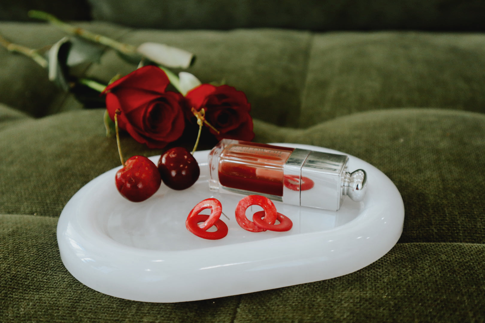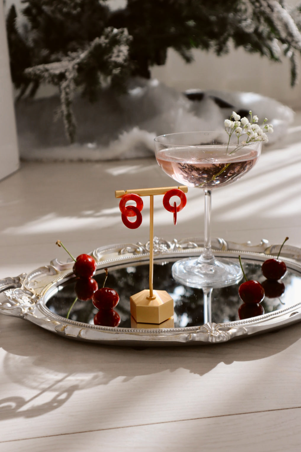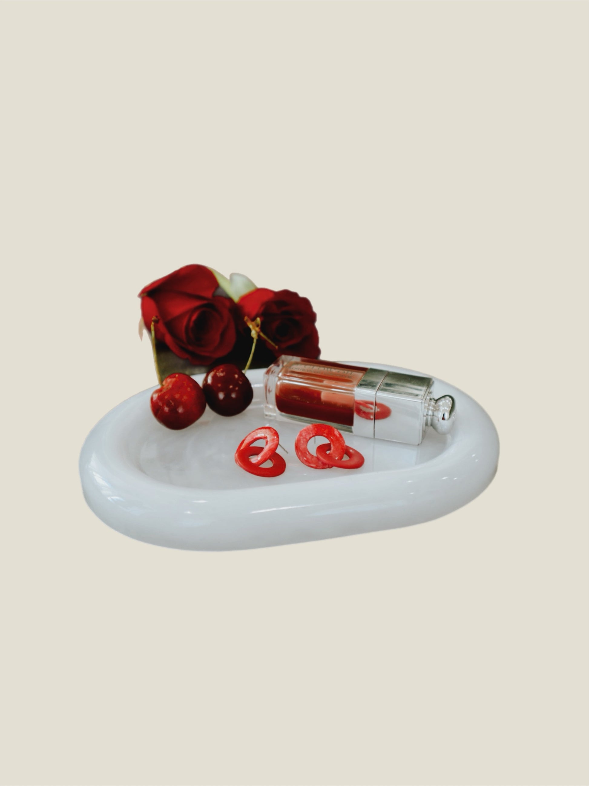 The Cherry Noir Gift Bundle pairs our white-marbled resin Cecelia tray (6.5” x 4.75”) with cherry-red earrings handmade by Lavish Morena — a woman-owned, Austin, TX based brand rooted in travel, color, and Latin culture.